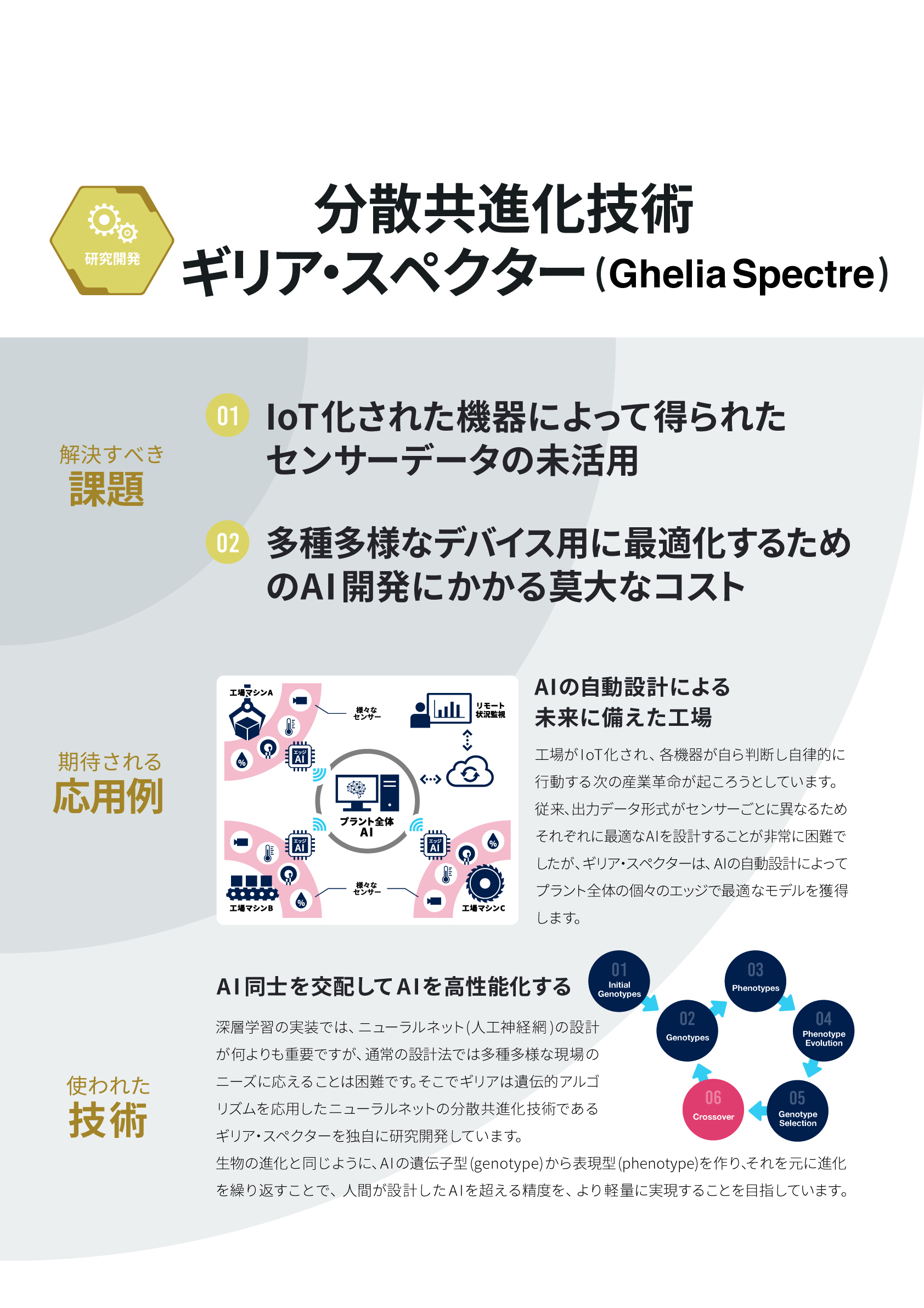 GHELIA SPECTREは、人間による人工ニューラルネットワークのパラメータチューニングではなく、条件に合わせてAIが人工ニューラルネットワークを1から製造するというのもです。GHELIA SPECTREの登場でこれまでかかっていた莫大な開発工数の短縮や、必要ないファイルを削除(最適化)し、軽量化することでの安定した通信の実現が期待されます。