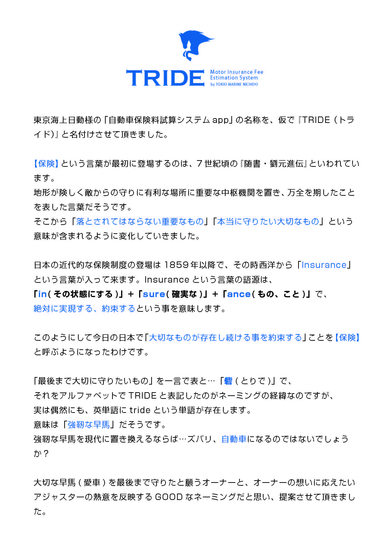 日本の近代的な保険制度の登場は1859 年以降で、その時西洋から「Insurance」という言葉が入って来ます。Insurance という言葉の語源は、「in( その状態にする)」+「sure( 確実な)」+「ance( もの、こと)」で、絶対に実現する、約束するという事を意味します。このようにして今日の日本で「大切なものが存在し続ける事を約束する」ことを【保険】と呼ぶようになったわけです。「最後まで大切に守りたいもの」を一言で表すと…「砦( とりで)」で、それをアルファベットでTRIDE と表記したのがネーミングの経緯なのですが、実は偶然にも、英単語にtride という単語が存在します。